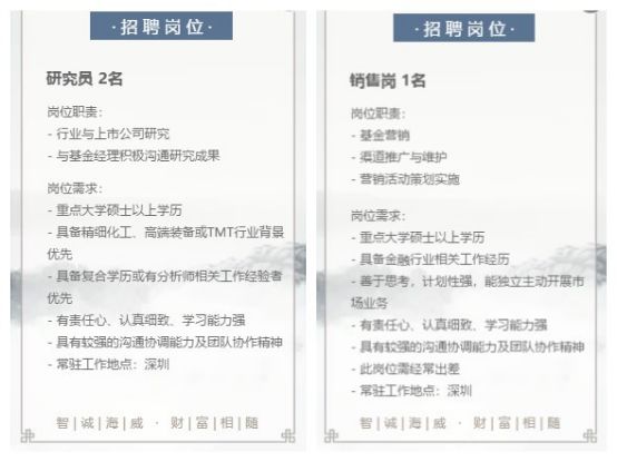智诚海威投资2019年的招聘,主要包括2名研究员,1名销售岗、1名综合岗和1名交易员。