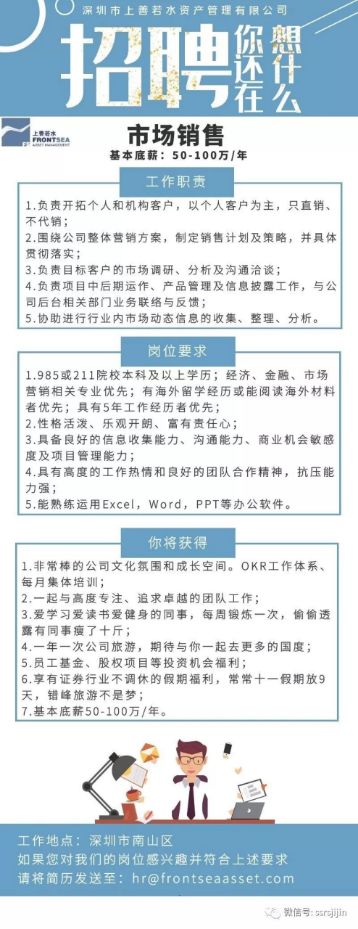 我们先来看看一些直接写明了薪酬待遇的招聘,比如深圳的上善若水资产近期发出的招聘广告,招聘市场销售岗位,主要是开拓个人和机构客户,做整体营销方案等。其给出的待遇比较诱人,基本底薪是每年50-100万,还包括员工基金、股权项目等投资机会福利,以及一年一次的公司旅游,包括去海外。