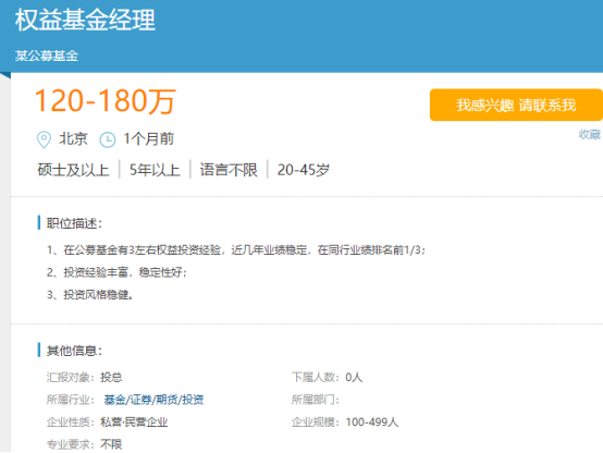 另外,基金君从招聘网站上也看到,北京某家公募是国内最早成立的十家基金管理公司之一,其最近招聘权益基金经理,给出的薪酬待遇是120-180万,要求基金经理在公募有3年左右的权益投资经验,业绩稳定在同行业排名前三分之一,投资风格稳健。