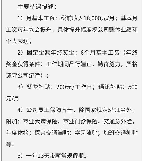 也有一些招聘广告上直接写着给予员工的基本待遇,比如北京某家中小型私募月基本公司是1.8万,每年会提升,看公司业绩和个人表现,还有固定年终奖是6个月的基本工资,另外包括餐费通讯补贴,5险1金、大病医保、学习津贴等,还有一年13天带薪常规假期。