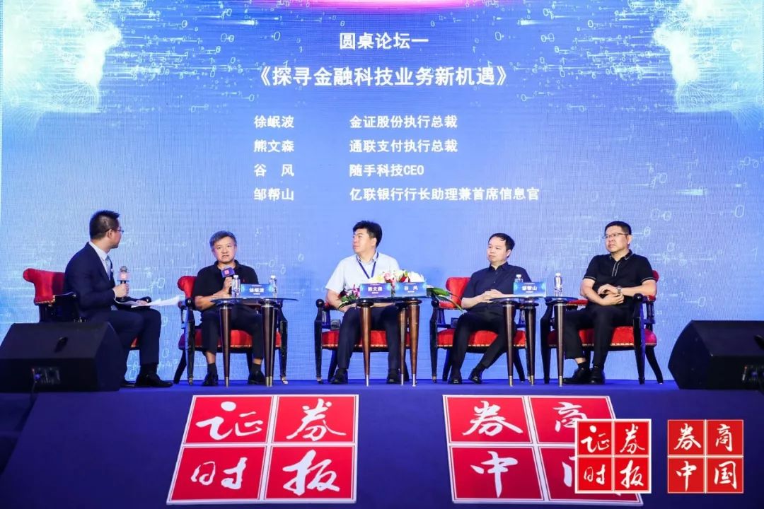 在第一个圆桌论坛环节,四位嘉宾围绕金融科技未来发展变化进行了探讨,嘉宾分别为:金证股份执行总裁徐岷波、通联支付执行总裁熊文森、随手科技CEO谷风、亿联银行行长助理兼首席信息官邹帮山。