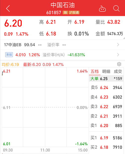 受10亿吨级有油田发现消息刺激,中国石油开盘后,A股上涨1.47%,H股上涨1.77%,石油板块也随之大涨。