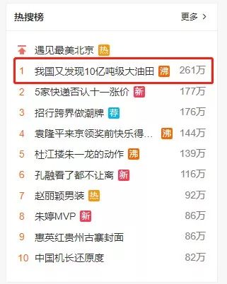 我国又发现10亿吨级大油田,这一重大喜讯迅速登上新浪微博热搜,并且从昨晚到今早,一直处于热搜榜第一的位置。