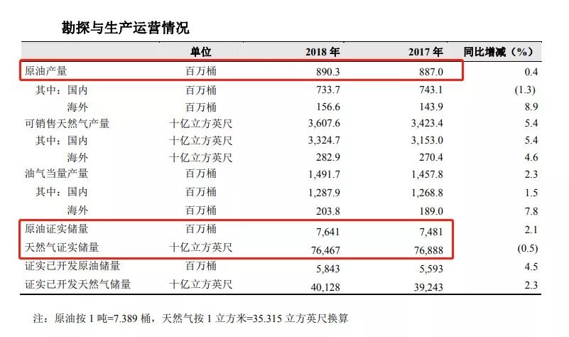中石油的年报显示,2018 年集团原油产量 890.3 百万桶,比上年同期增长 0.4%;可销售天然气产量 3,607.6 十亿立方英尺,比上年同期增长 5.4%,油气当量产量 1,491.7 百万桶,比上年同期增长 2.3%。