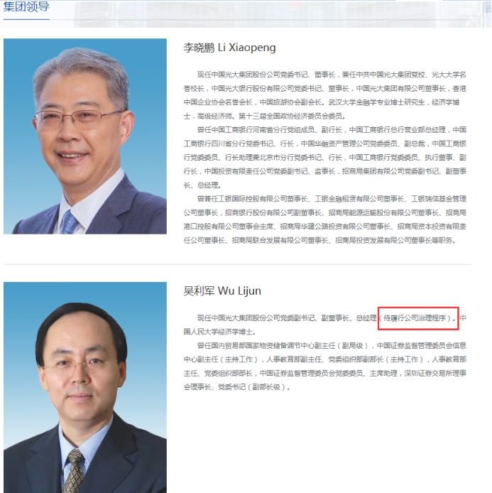 记者在光大集团官方网站“集团领导”栏目已经出现吴利军的信息,吴利军现任中国光大集团股份公司党委副书记、副董事长、总经理(待履行公司治理程序)。