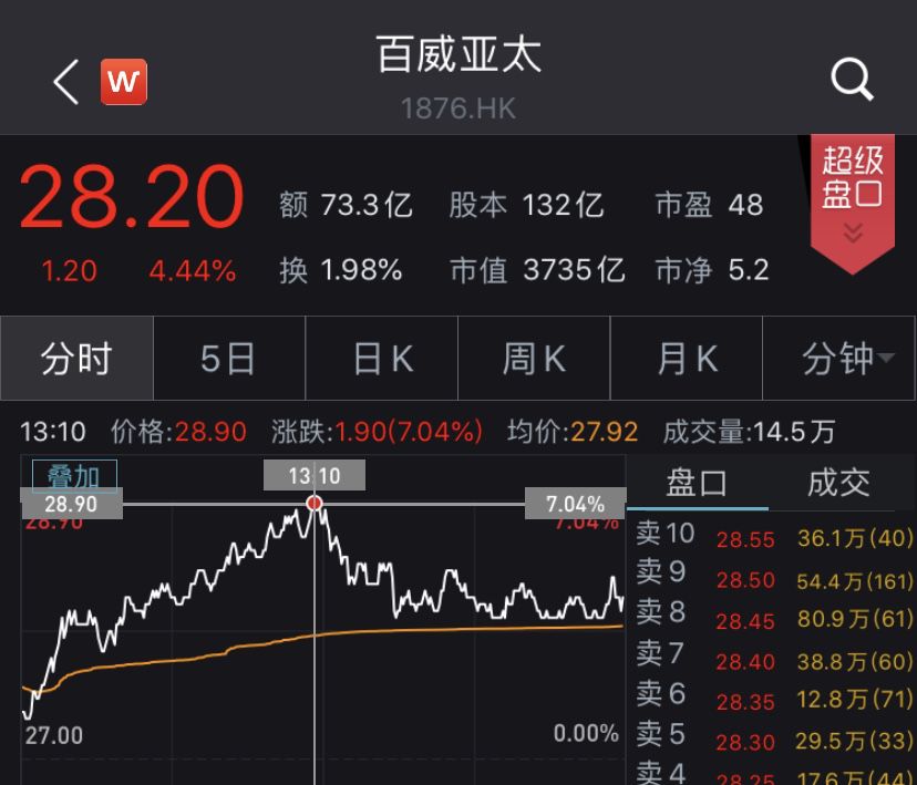 9月30日,“啤酒巨头”百威亚太正式登陆港交所,股票代码01876。开盘后股价走高,盘中最高报28.9港元,上涨7.04%;午后小幅回落,收盘报28.2港元,上涨4.44%,总市值3735亿港元。公告显示,公司发行14.52亿股,每股定价27港元,每手100股,净筹约392亿港元。