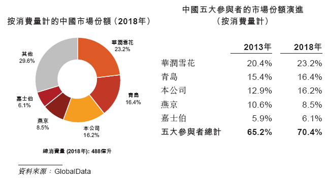 按消费量计算,于2018年华润雪花啤酒为市场领导者,其次为青岛及百威亚太。其中三品牌按消费量计的中国市场份额,华润雪花为23.2%、青岛为16.4%、百威亚太为16.2%。