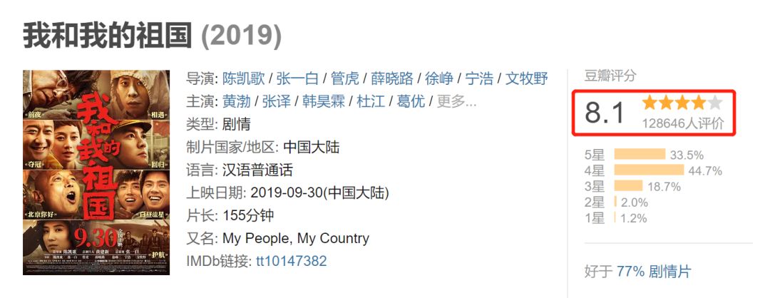 其中《我和我的祖国》以7个故事回溯新中国成立70周年重大历史瞬间下的全民回忆,该电影以36%的排片,9.12亿的票房成绩领跑国庆档,成为叫好又叫座的电影。在豆瓣上,已有近13万人给该影片打出了平均8.1的高分。