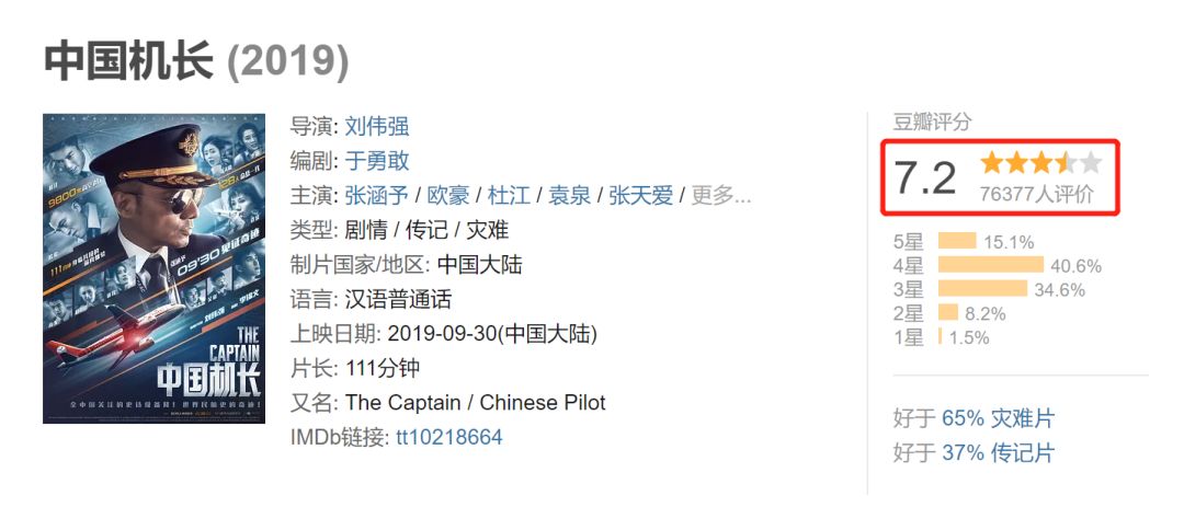 紧随其后的是《中国机长》根据2018年四川航空真实事件改编:机组执行航班任务时,在万米高空突遇驾驶舱风挡玻璃爆裂脱落、座舱释压险情,生死关头,他们确保了机上全部人员的生命安全,该片近三日平均排片率30.3%,目前累计票房6.34亿。目前有近8万人在豆瓣上给该影片打出平均7.2的评分。