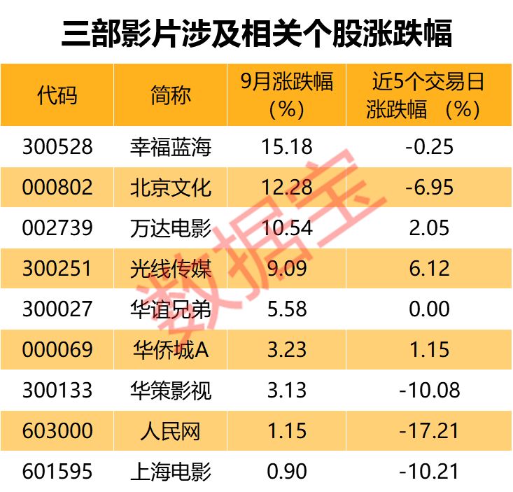 根据数据宝之前文章《突发爆款,这些股票先火了,国庆档强势来袭,最完整受益股名单》的报道,三部电影涉及9只A股,分别为光线传媒、万达电影、华侨城A、华谊兄弟、幸福蓝海、北京文化、华策影视、上海电影、人民网。