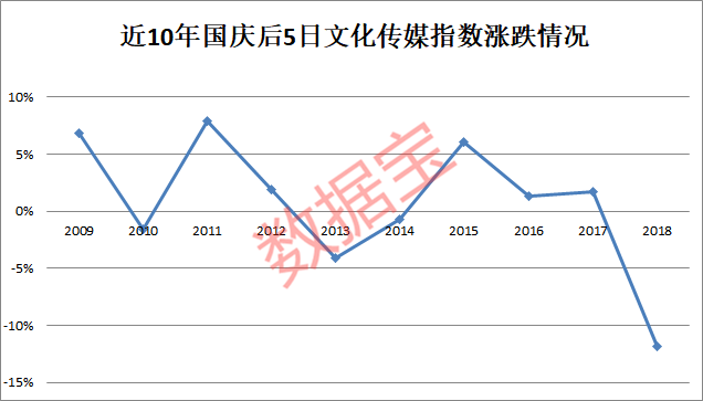 历史上,国庆节后影视股表现如何?数据宝统计显示,近10年国庆节过后的五个交易日,沪指上涨概率超六成,文化传媒指数近10年有6次实现上涨。2018年由于影视行业整顿,国庆后5个交易日文化传媒指数大跌超11%,创近10年跌幅最大的一次。如果剔除2018年,2009年至2017年国庆节后5个交易日文化传媒指数平均涨幅超2%。