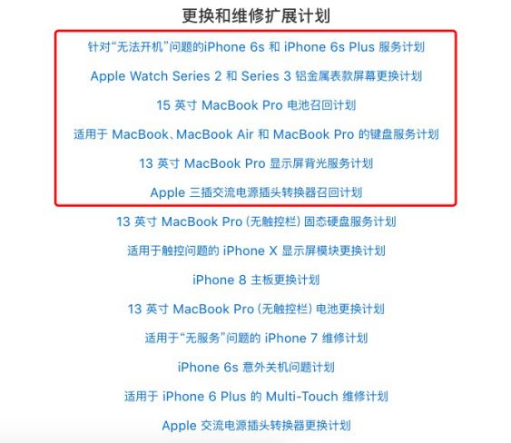 今年,苹果公司为Apple Watch Series 2和Series 3的屏幕、15英寸MacBook Pro电池、MacBook键盘、13英寸MacBook Pro显示屏背光灯、以及Apple三插交流电源插头转换器等启动了维修或召回计划。