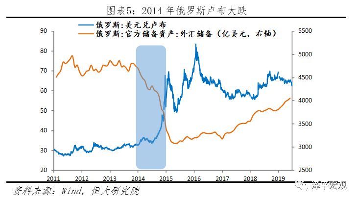 第七,在目标国经济疲软或被金融制裁时,利用资本做空并促使非美货币大幅贬值,资金恐慌性外逃,引发金融市场动荡。2014年美欧联合制裁俄罗斯,使得俄罗斯资金大量外逃,卢布大幅贬值,2014年年内卢布兑美元最高贬值56%。