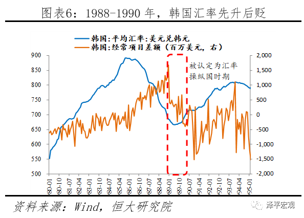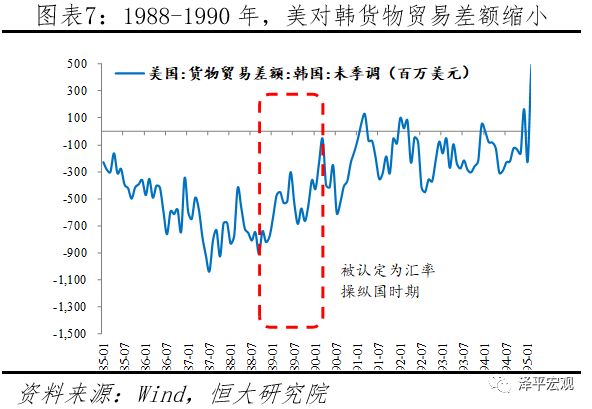 历史上,美国将韩国、中国台湾列为“汇率操纵国(地区)”,韩国、中国台湾在经历货币升值、对美贸易顺差减少、放松外汇管制、无力对美产生威胁后得以移出“汇率操纵国”名单。其中,韩国于1988年10月、1989年4月、1989年10月3次被美国列为汇率操纵国,主要原因在于美国认为韩国存在对美巨额贸易顺差、经常账户大量盈余、外汇和资本管制、汇率调整滞后等问题。1985年1月到1988年9月,美国对韩国的单月货物贸易逆差从2.3亿美元扩大到9.1亿美元。同期,韩国对外经常项目差额从-5.6亿美元上升到13.3亿美元。因此1988年10月美国以巨额对美贸易顺差、经常账户大量盈余等问题为由将韩国列为汇率操纵国。被列为操纵国后,韩国主动升值其货币,1988年10月到1989年5月升值6.0%,这导致韩国经常项目差额大幅萎缩,1989年12月韩国经常项目差额同比下降59.6%。美国对韩国的货物贸易逆差从1988年10月的7.4亿美元缩小至1990年4月的4亿美元。但是在此期间美国对韩元的升值幅度不满意,以1985年之后韩元的累计升值幅度不及日元和台币、汇率机制并非市场化、金融市场不开放、外汇和资本管制、汇率调整滞后等为由,于1989年将韩国列为“汇率操纵国”。韩国随后放松外汇和资本管制、启用了“市场平均汇率制度”。尽管1989年韩元再度出现了贬值,但贸易加权汇率稳定,考虑到急剧恶化的国际收支和大量的资本外流是韩元贬值的主因,叠加韩国日益恶化的经常项目,美国于1990年撤销了韩国“汇率操纵国”的认定。