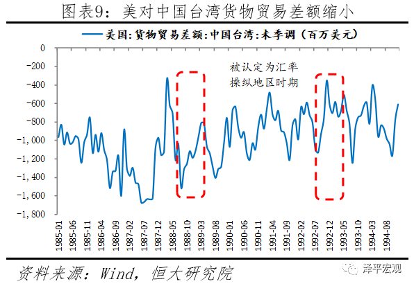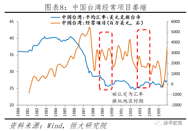 中国台湾于1988年10月、1989年4月、1992年5月和1992年12月,4次被美国列为“汇率操纵地区”,其原因包括巨额对美贸易顺差、大量经常性账户余额以及台湾严格的外汇管制。1988年至1989年4月被美国认定为汇率操纵地区后,中国台湾对外贸易受到明显冲击。1988年经常项顺差同比下滑43%,经常项目顺差占GNP比重从1987年的18.4%下降至8.3%,台币升值6.5%。尽管1991年中国台湾对美国贸易顺差下滑,但是经常项目顺差两位数增长、1992年4月起的新台币贬值趋势以及高达832亿美元的外汇储备使美国在1992年5月再次将中国台湾认定为“汇率操纵地区”。此后中国台湾加大对美国商品进口力度,并且将企业和个人的非贸易外汇管制额度从300万美元提升至500万美元,中国台湾经常项顺差占GDP比重从1991年的6.7%下降至1992年的3.8%,美国于1993年撤销“汇率操纵地区”的指控。