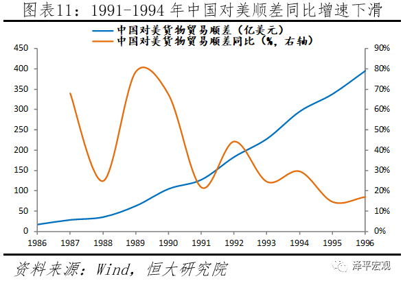 1992-1994年中国曾连续5次被美国认定为“汇率操纵国”,主要原因是当时中国存在高度的外汇管制、双轨汇率制度扭曲市场以及限制进口的做法,美方认为中国对美存在不公平的贸易顺差。1991年,美国发起针对中国的贸易政策调查,并于1992-1994年将中国列为汇率操纵国,其主要理由有两大方面:一是中国存在高度的外汇管制,扭曲市场。当时货币当局采取包括配额在内的多种方式来严格管控外汇在市场上的自由流通,这使得官方汇率与市场汇率并行,不能真正反映外汇市场的供求。二是美国认为中国的贸易顺差主要是通过限制国外进口产品流入以及恶意操纵人民币汇率而形成的不公平贸易顺差和经常账户盈余。被认定为“汇率操纵国”后,中国开展外汇管理体制及汇率制度改革,人民币汇率一次性大幅贬值后基本维持平稳,但对美货物贸易顺差同比在此期间有所下滑。伴随1993年底国务院颁布《关于进一步改革外汇管理体制的通知》,1994年起中国从官方汇率与市场汇率并存的双轨汇率制,转为以市场供求为基础的管理浮动汇率制度。同时,中国实行结售汇制度,并建立全国统一的外汇交易市场,减少外企购买外汇的不必要限制。1992-1993年,人民币汇率有所贬值,并于1994年初人民币汇率一次性贬值33%,但在此期间中国对美出口增速下滑;顺差仍在扩大,但同比增速放缓。其中,1994年中国对美出口同比23%,较1991-1992年分别下降1.5和12.6个百分点。