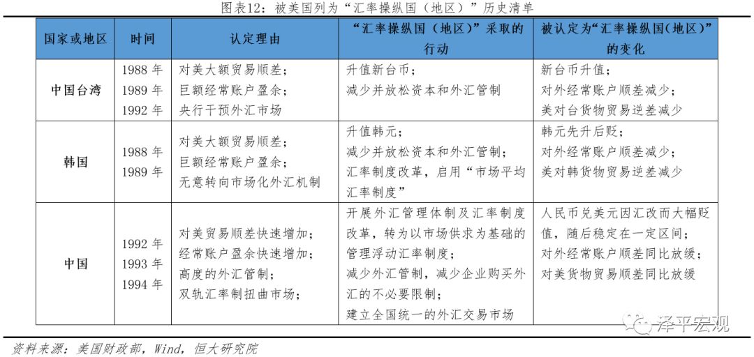 历史上中国(1992-1994年连续5次)、韩国(1988年10月、1989年4月、1989年10月,3次)、中国台湾(1988年10月、1989年4月、1992年5月和1992年12月,4次)、日本等均被美国认定为“汇率操纵国(地区)”,美国以此为手段要求其他货币升值、降低上述国家(地区)对美出口增速和顺差、要求放松外汇管制,直至对美威胁下降才被移出“汇率操纵国”名单。中国在1992-1994年被认定为“汇率操纵国”后,开展外汇管理体制及汇率制度改革,减少外汇管制,从双轨汇率制转向有管理的浮动汇率制,人民币兑美元汇率在大幅贬值后基本维持平稳,但对美货物贸易顺差同比在此期间放缓。