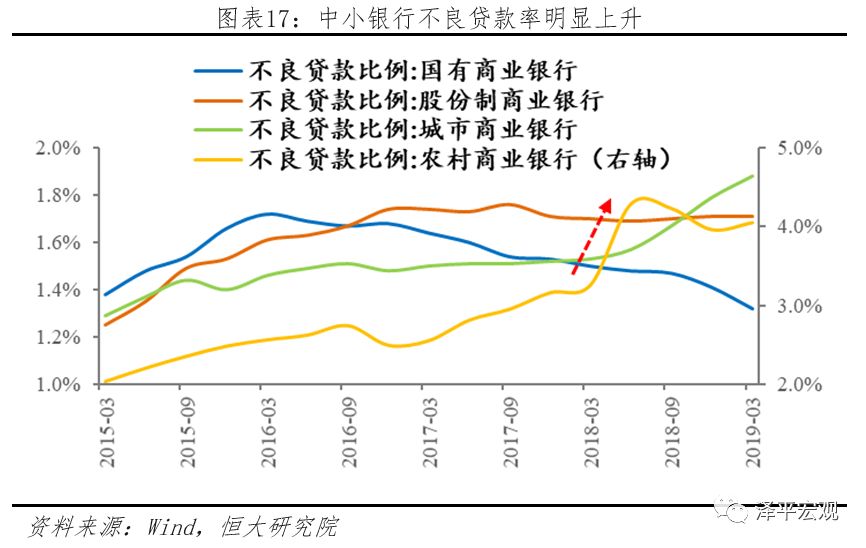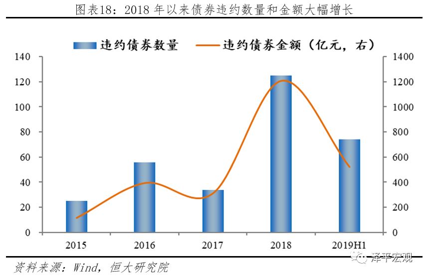 2018年以来中国债券市场违约事件大幅增多,近期包商银行被接管,银行业打破刚兑,引发同业市场和非银市场流动性风险,引发市场对金融体系信用风险的担忧。第一,债券违约事件频发,导致市场风险偏好下降。2018年债券违约事件125起,违约金额1209.57亿元,数量和规模都超过2015-2017年违约债券之和,2019年上半年违约事件74起,已经超过2018年半数。第二,近期包商银行被接管,银行业金融机构打破刚兑,短期流动性收缩,长期信用风险引起市场担忧,市场风险偏好进一步降低。目前中国仍然存在大量中小银行经营风格较激进,定位不清晰,经营管理理念、战略规划及科技实力弱,这都构成中国金融体系的潜在风险。截至2018年末,我国城商行、农商行以及其他农村金融机构分别达134、1427和2473家,在城商行中,包商银行资产规模位属前列。包商银行事件虽为个例,但不排除其他中小银行也存在相同的信用问题,在公司治理、盈利能力、资产质量、资本充足水平方面的问题将逐渐暴露,一旦其他中小银行继续爆雷,将可能引起金融市场大面积信用事件爆发,形成系统性风险。