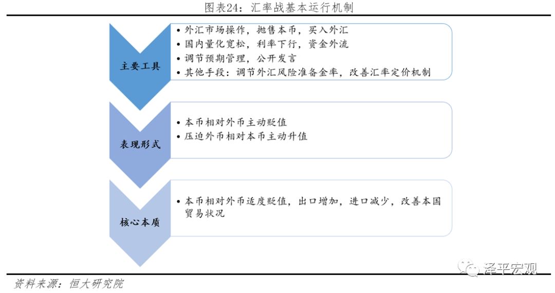 汇率战是美国在金融战中最常使用的打击手段,历史上美国曾多次参与或对他国发起汇率战。各国经济的最终表现分为三类:一是多败俱伤,世界贸易萎缩,经济萧条,如上世纪30年代大萧条汇率战;二是美国贸易逆差短期改善,长期无改善,非美国家采取错误宏观政策导致泡沫破裂、经济萧条,如上世纪80年代美日贸易战;三是美国贸易逆差短期改善,长期无改善,非美国家通过稳健货币政策、推动供给侧改革实现经济持续发展,如上世纪80年代美德汇率战。