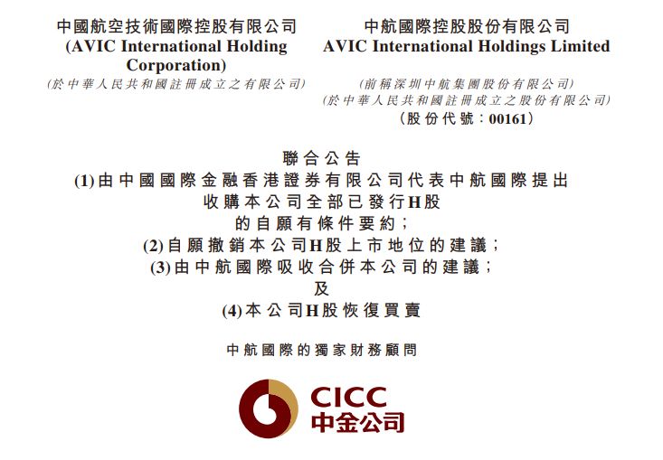 10月2日晚间,港股上市公司中航国际控股公告称,其控股股东中航国际计划以每股要约价9港元收购公司全部已发行H股,在H股要约成为无条件后,该公司将申请自愿撤销H股于联交所的上市地位。