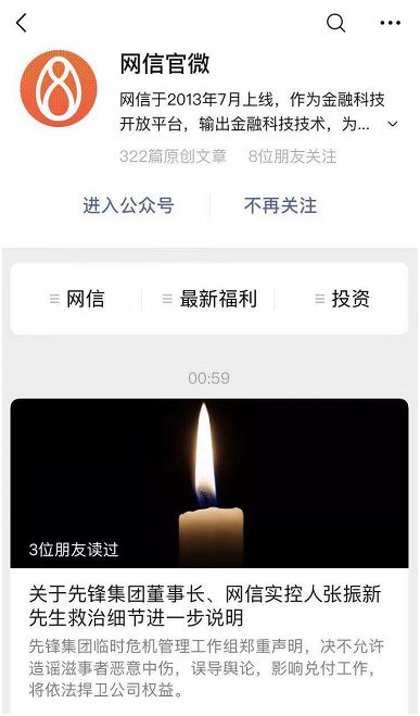 今日凌晨,网信官微正式发布关于先锋集团董事长、网信实控人张振新先生救治细节的进一步说明。