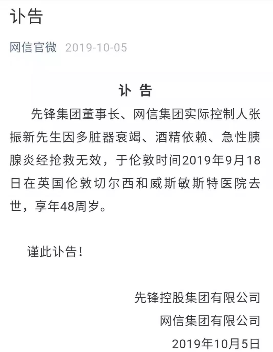 10月5日,网信官微发布讣告,称先锋集团董事长、网信集团实际控制人张振新先生因多脏器衰竭、酒精依赖、急性胰腺炎经抢救无效,于伦敦时间2019年9月18日在英国伦敦切尔西和威斯敏斯特医院去世,享年48周岁。