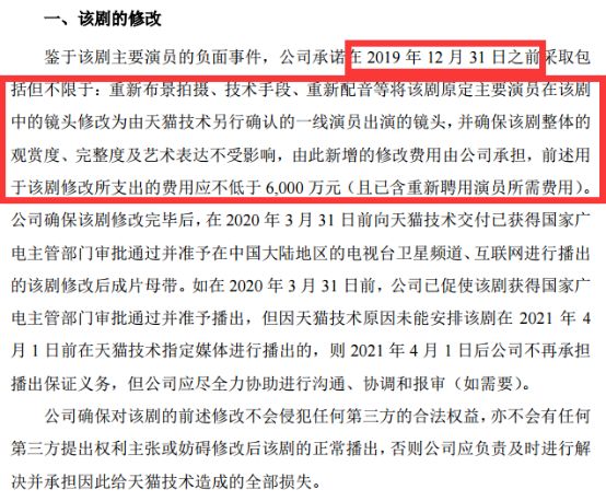 公告称,鉴于该剧主要演员的负面事件,公司承诺在2019年12月31日之前将采取包括但不限于:重新布景拍摄、技术手段、重新配音等将该剧原定主要演员在该剧中的镜头修改为由天猫技术另行确认的一线演员出演的镜头,费用不低于6000万元。