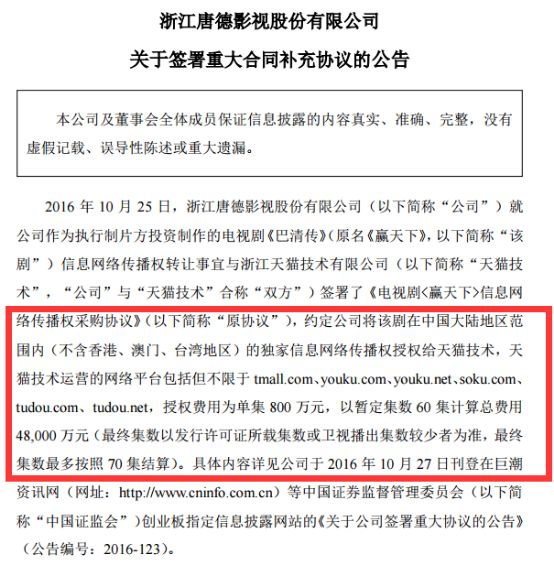 10月8日,唐德影视发布公告称,将投入超6000万元换掉主演等,重拍《巴清传》。
