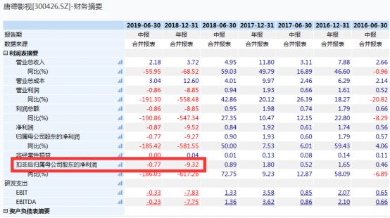 财报显示,自2015年上市后,主营影视制作发行的唐德影视一直保持盈利,市值也曾一度超过800亿元,但去年归母净利润忽然巨亏9.27亿元,营业收入则同比减少68.52%。