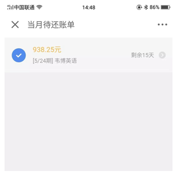 学员王明(化名)跟媒体投诉,去年下半年在韦博英语报班,原本打算报2级别的课程,学费在3万元左右,但招生老师游说,级别越高优惠越大,最后其报了4级别、总价近3万九千的课程。在拿银行卡付费时,招生老师又说,现在韦博和贷款机构有合作,贷款不用利息,付了个首付,剩下的都可以分期贷款来付。于是他便办理了一个34期的分期贷款,目前还剩6期未还。