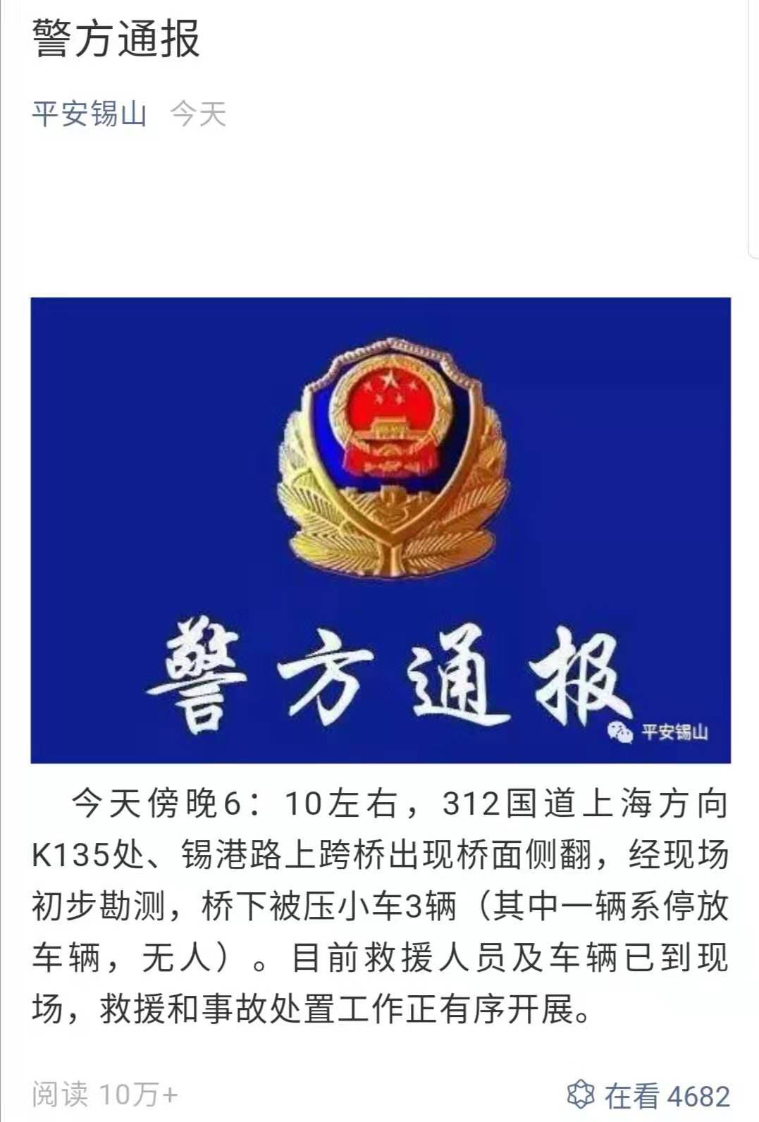 事发后,当地警方对这起事故进行了通报:今天傍晚6:10左右,312国道上海方向K135处、锡港路上跨桥出现桥面侧翻,经现场初步勘测,桥下被压小车3辆(其中一辆系停放车辆,无人)。目前救援人员及车辆已到现场,救援和事故处置工作正有序开展。