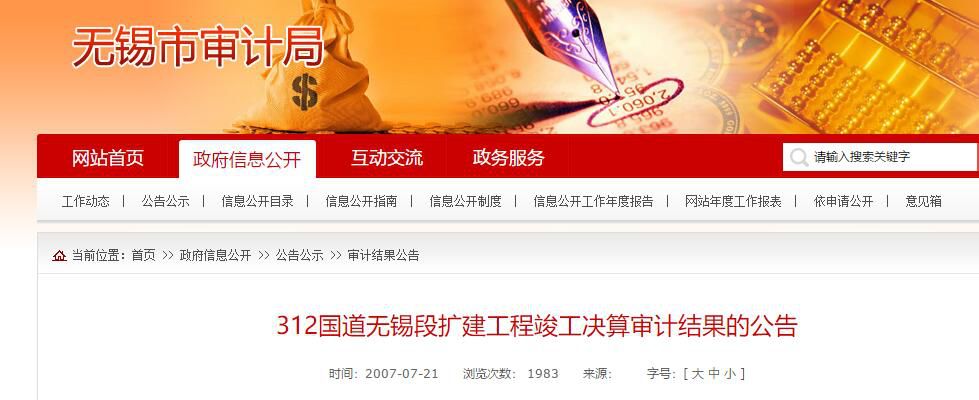设计方是苏交科?公司发公告否认无锡市审计局网站在2007年7月曾发布《无锡市审计局关于312国道无锡段扩建工程竣工决算审计结果的公告》。