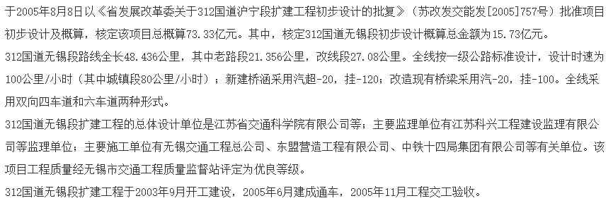 公告显示,312国道无锡段路线全长48.436公里,其中老路段21.356公里,改线段27.08公里。全线按一级公路标准设计,设计时速为100公里/小时(其中城镇段80公里/小时)。312国道无锡段扩建工程于2003年9月开工建设,2005年6月建成通车,2005年11月工程交工验收。