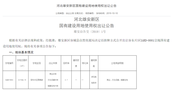 10月10日,雄安新区容城县自然资源局挂牌出让一宗土地,这是雄安新区首次公开卖地,该地用于建设雄安商务服务中心项目,标志着雄安新区大规模城市开发建设进入实施阶段。