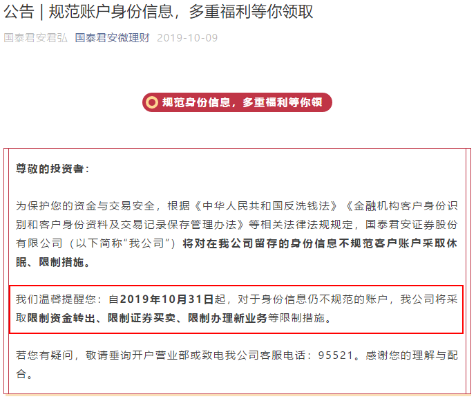 9月初,国泰君安微理财官微发布通知,自10月31日起,身份信息仍不规范的账户,公司将采取限制资金转出、限制证券买卖、限制办理新业务等限制措施。在3个多月前,国泰君安官网也发布了《关于对身份信息存疑客户账户采取休眠、限制措施的公告》,表示将从6月1日起分批次对相关账户采取措施。