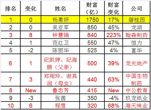 从前十大女富豪来看,最新榜单狂增56%,平均财富达到了654亿,远远高于前10大男企业家的涨幅——8%!