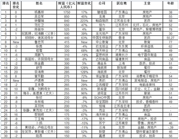 12位落榜者,分别是因申请公司破产重整而未上百富榜的周晓光;因财富没有达到105亿门槛而未上榜的东方园林的何巧女、瑞声科技的吴春媛、新奥能源的赵宝菊、欧普照明的马秀慧、王颖母女、时代地产的李一萍、嘉鑫控股的吕慧、陈宁宁母女、圆通速递的张小娟、裕通包装的吴兰兰、福信的黄曦、花样年的曾宝宝和彤程新材的张宁。