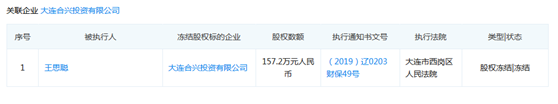 今年8月20日,大连市西岗区人民法院冻结了王思聪的大连合兴投资有限公司股权157.2万元人民币。