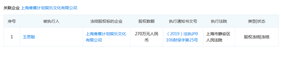 今年的7月15日,香蕉娱乐的运营主体,上海香蕉计划娱乐文化有限公司新增一条司法协助信息,王思聪被上海市静安区人民法院执行股权冻结,数额为270万元人民币。