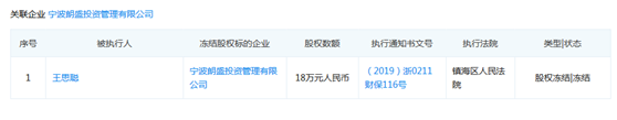 同一天,上海水晶荔枝娱乐文化有限公司被静安区人民法院冻结股权800万元人民币。7月9日,镇海区人民法院也冻结王思聪的宁波朗盛投资管理有限公司股权18万元人民币。