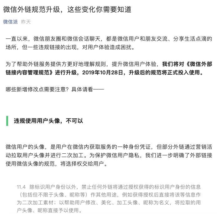 10月18日微信官方公众号“微信派”公告称,微信外链规范即将进行更新升级,将新增和细化多项外链规则。该规则将在10月28日正式施行。