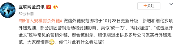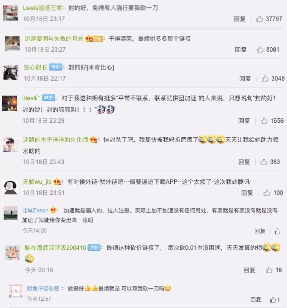 微信的这次“垃圾”外链大清理行动,获得网友疯狂点赞,尤其是无孔不入的拼多多“砍一刀”,网友不胜其烦,直呼“封得好”。