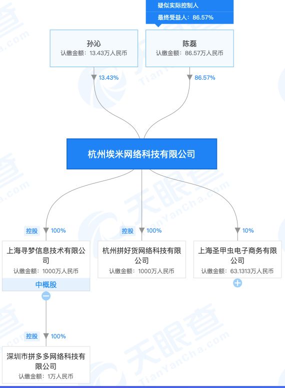杭州埃米网络科技有限公司成立于2015年4月,法定代表人为拼多多联合创始人孙沁,该公司全资控股拼多多的运营主体——上海寻梦信息技术有限公司。