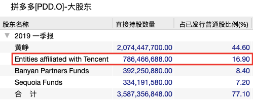 拼多多2019年一季报数据显示,腾讯对拼多多的持股比例是16.90%,为拼多多第二大股东。