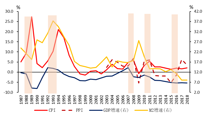 1987-1989年期间,中国的货币增速维持高速增长,M2、M1增速高达20%-30%。