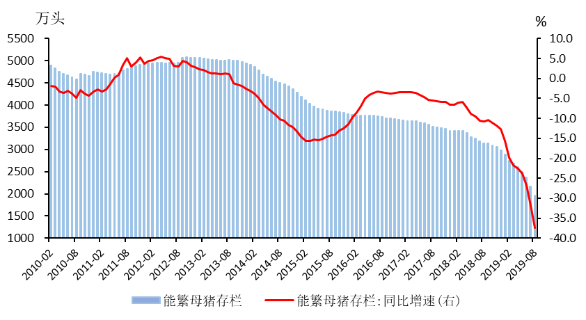 从猪肉价格的领先指标看,能繁母猪存栏增速还在继续下行,8月能繁母猪存栏增速跌至-37%,创历史最低点。