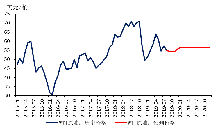 原油价格(WTI)价格年内小幅上升至56.5美元/桶,布伦特上涨至61美元/桶左右,2020年保持在这个价格;