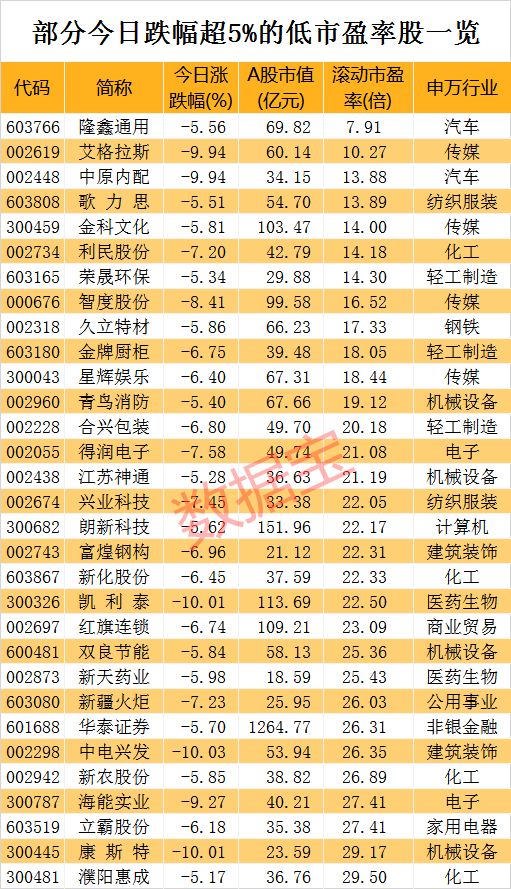 证券时报·数据宝统计显示,不含科创板股票在内,今日共有137股跌超5%。在这些个股中,包括不少低估值个股,其中31股最新滚动市盈率低于30倍。市盈率低于10倍的隆鑫通用今日股价一度逼近跌停,盘中最低价创五年来新低。隆鑫通用业绩快报显示,公司前三季度净利润为6.15亿元,同比增长0.8%。艾格拉斯、中原内配、歌力思等个股市盈率低于20倍,其中艾格拉斯、中原内配股价跌停。