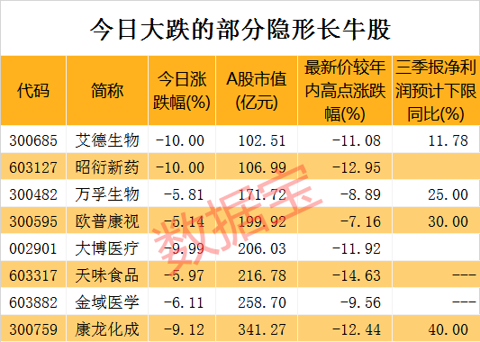 在上述137股中,不含今年下半年上市的次新股,近10日内股价创下历史高点,且今日股价跌幅超过5%的个股,共计8只,分别是大博医疗、天味食品、康龙化成、金域医学、昭衍新药、艾德生物、欧普康视、万孚生物。
