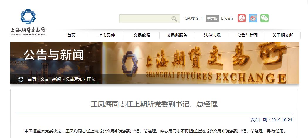 据上期所官网消息,中国证监会党委决定,王凤海任上海期货交易所党委副书记、总经理。席志勇不再担任上海期货交易所党委副书记、总经理,另有任用。
